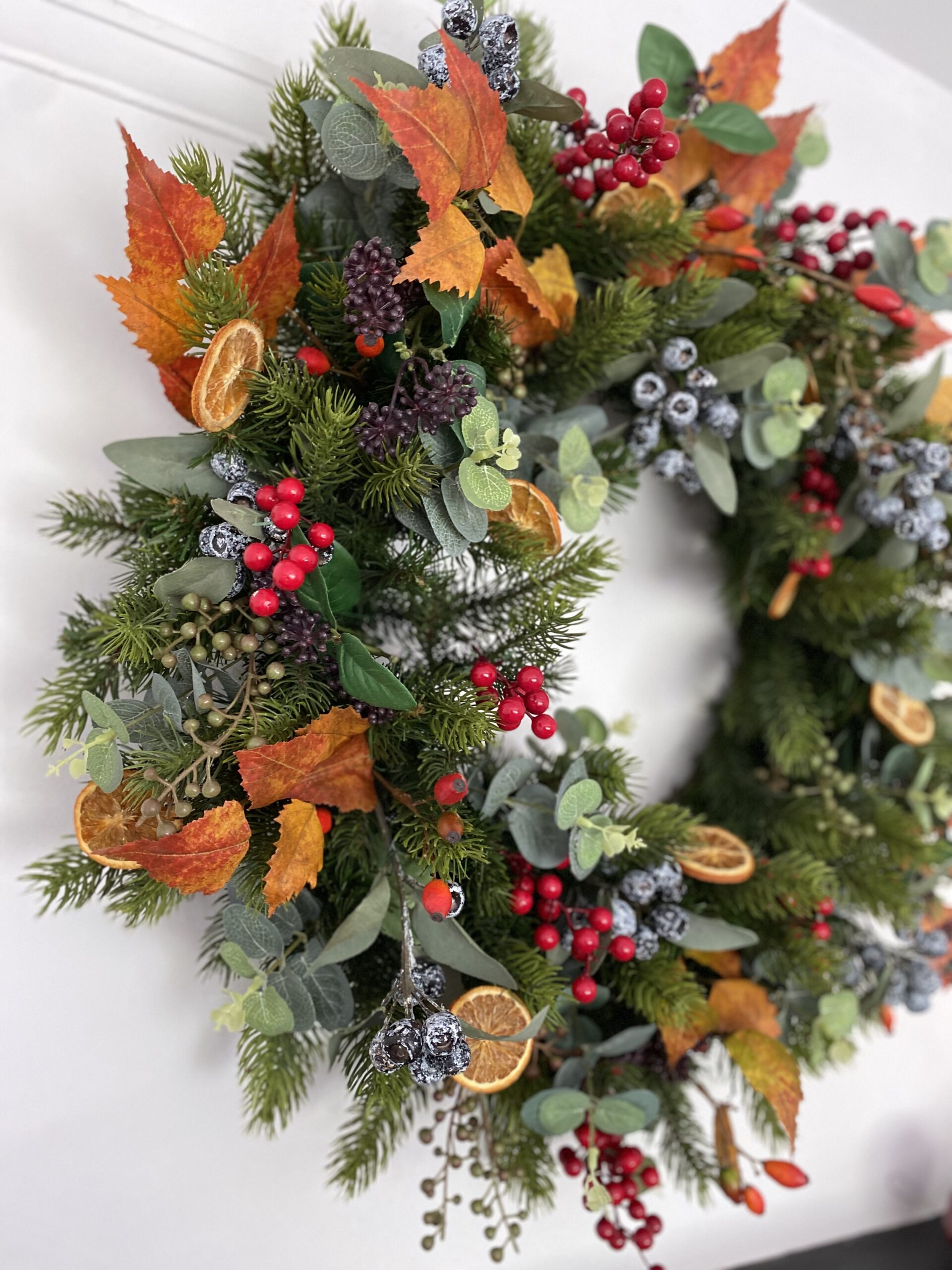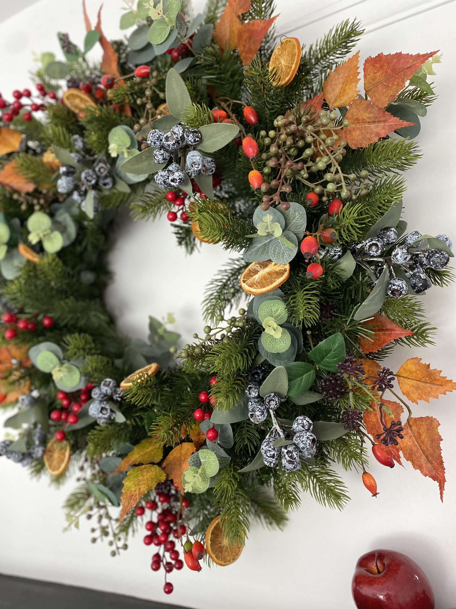 Wreath dressed with eucalyptus, berries, rosehips, orange slices and Autumn leaves.