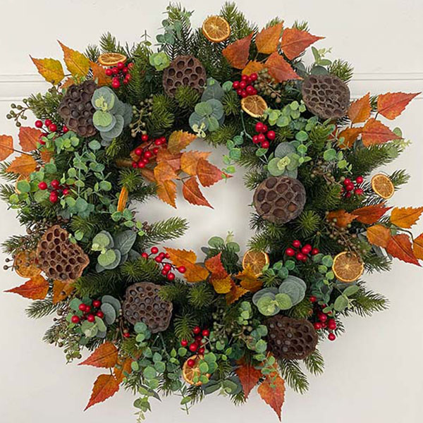 Wreath dressed with eucalyptus, berries, orange slices, leaves and lotus heads. A stunning orange coloured wreath.