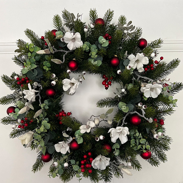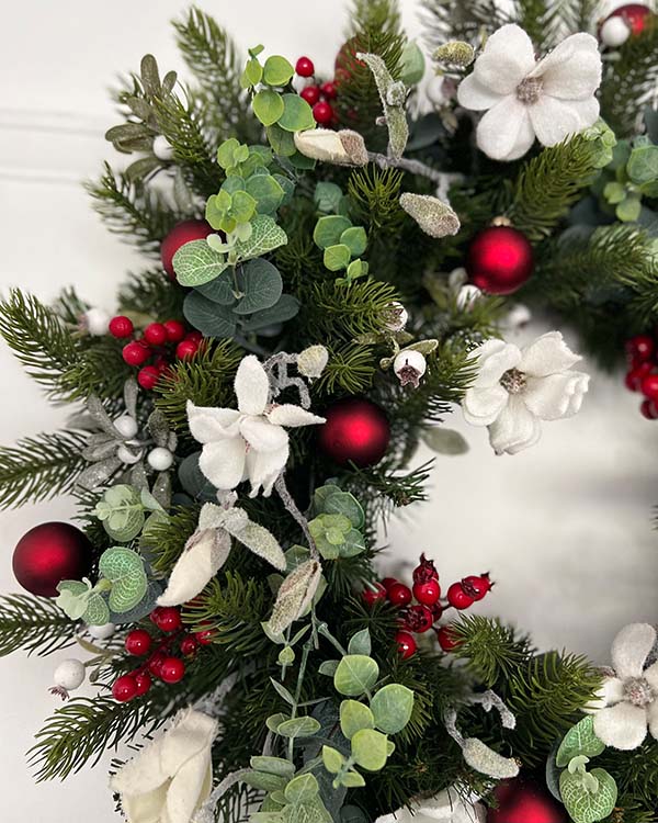 Wreath dressed with eucalyptus, mistletoe berries, magnolia, red berries and red glass baubles.
